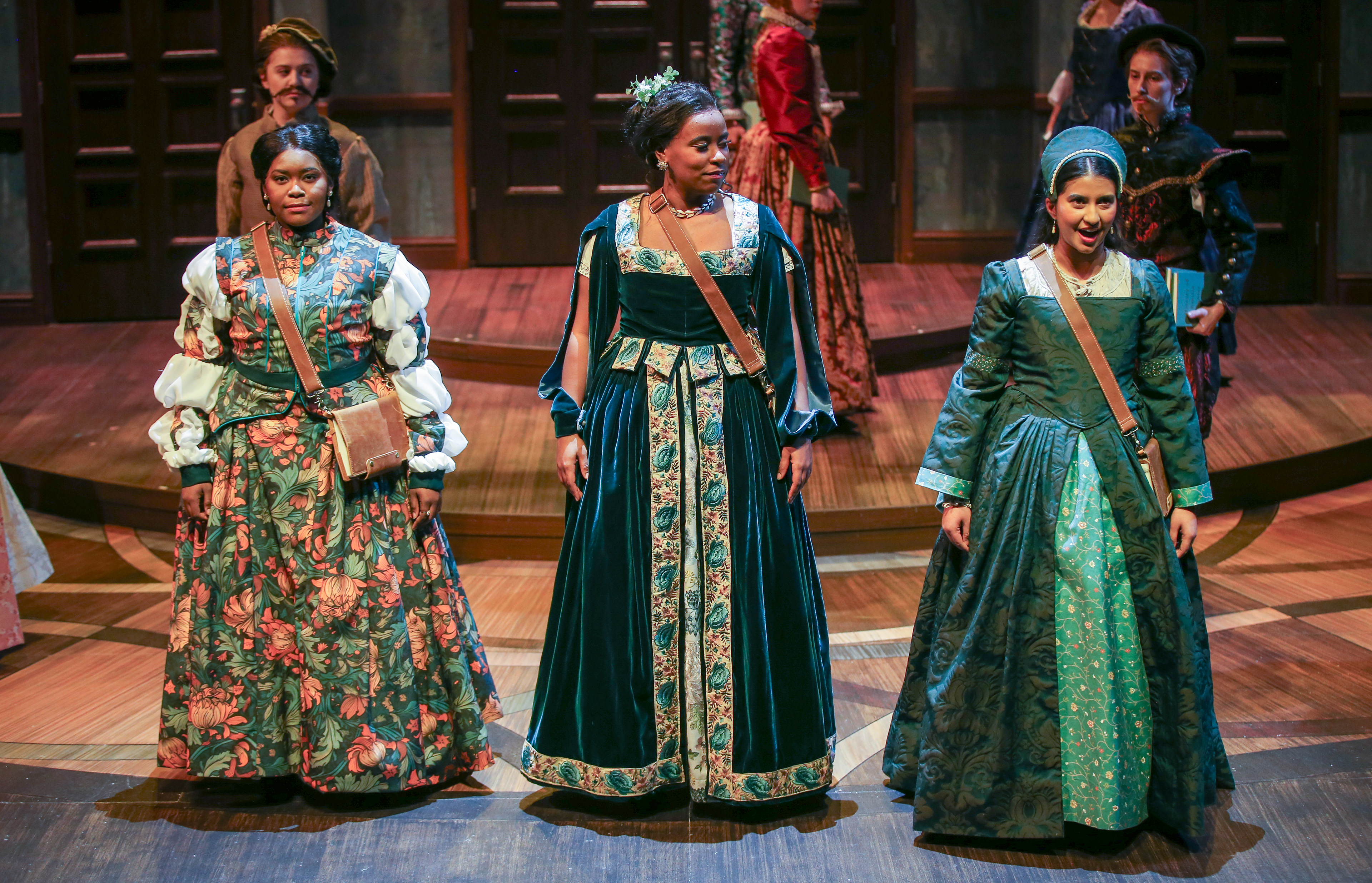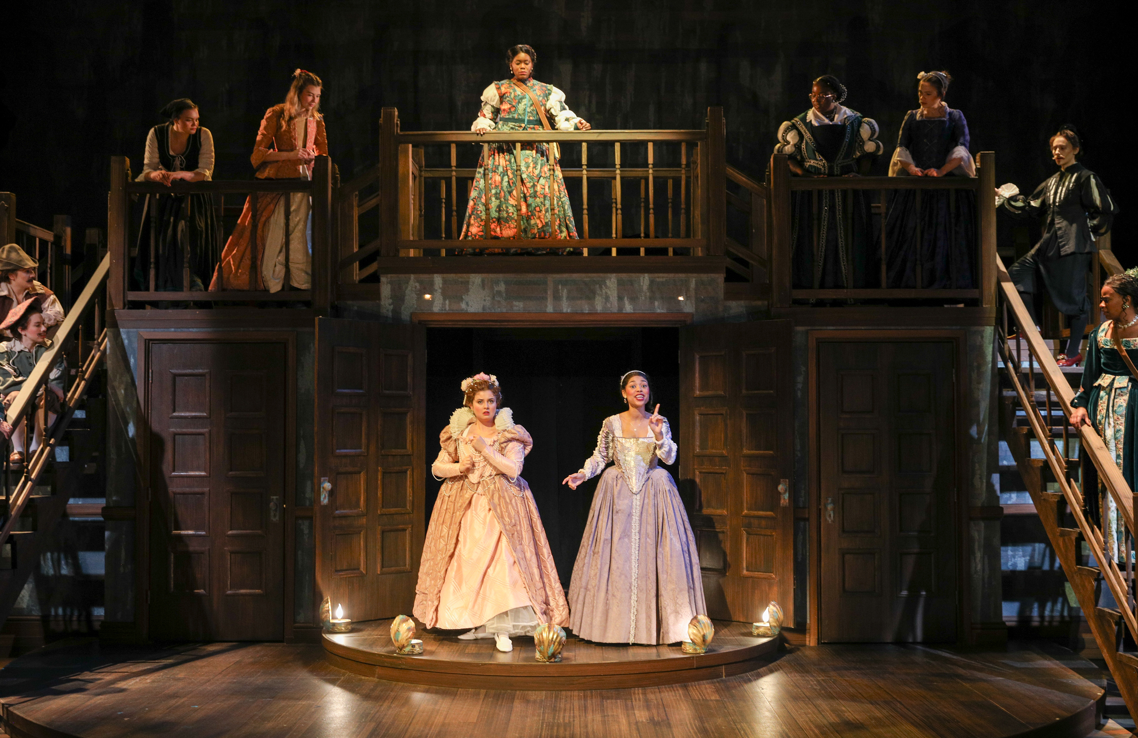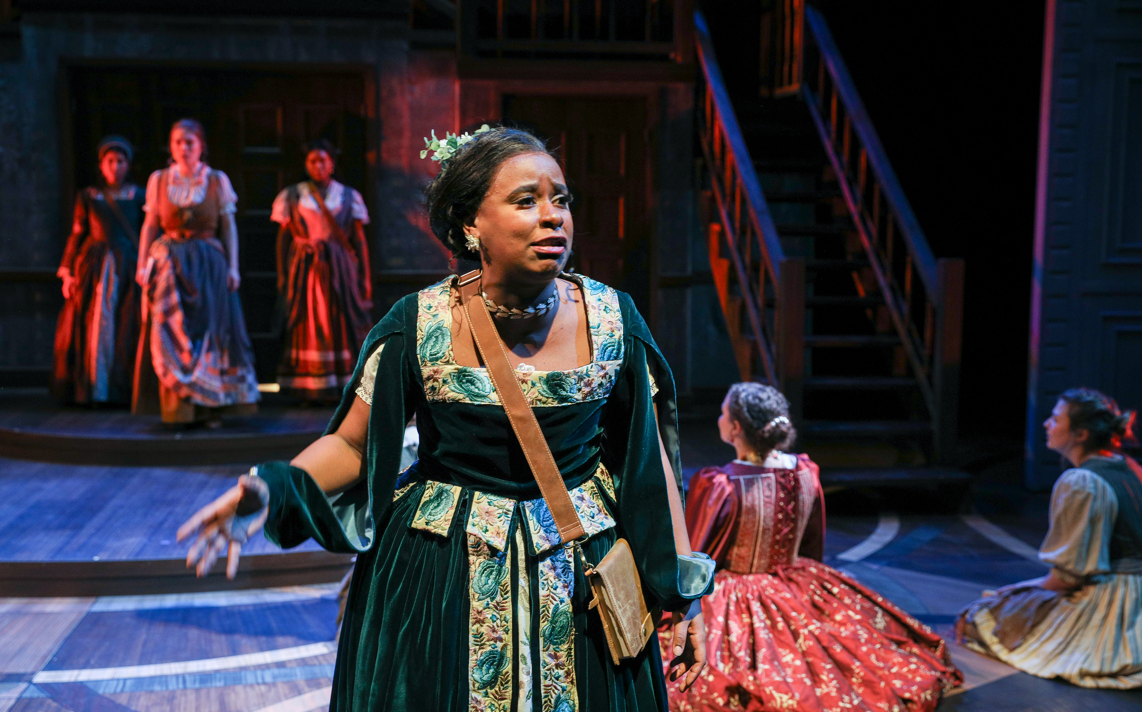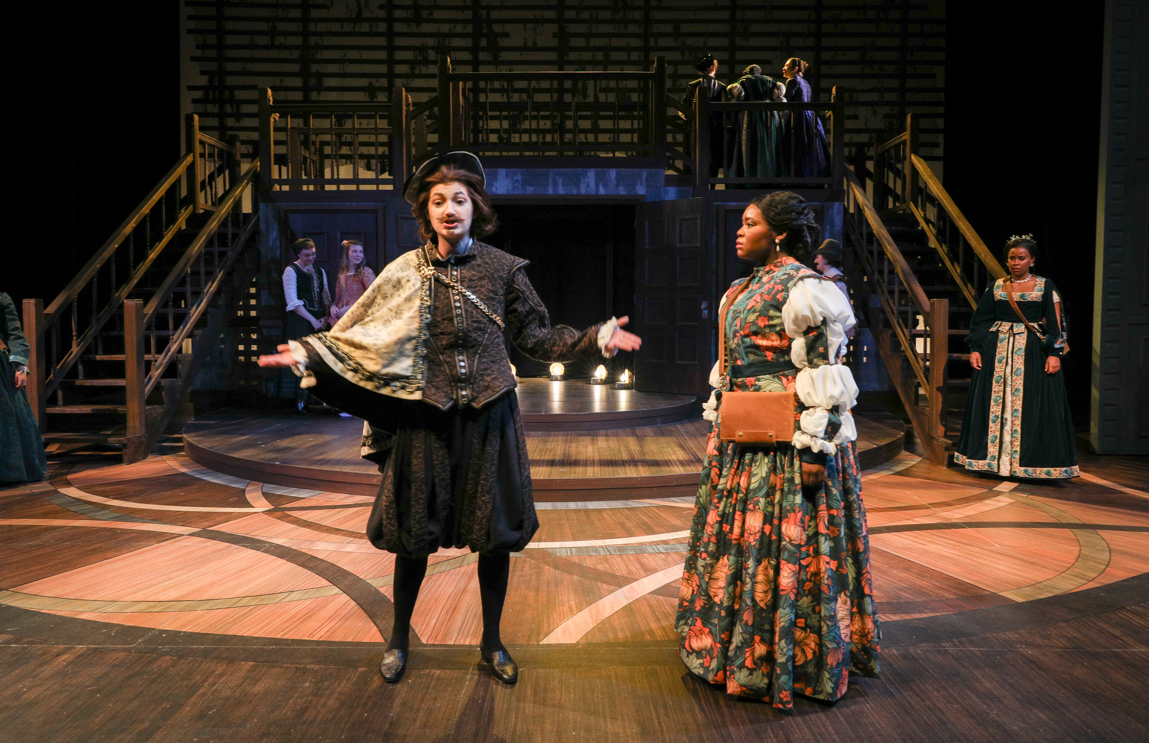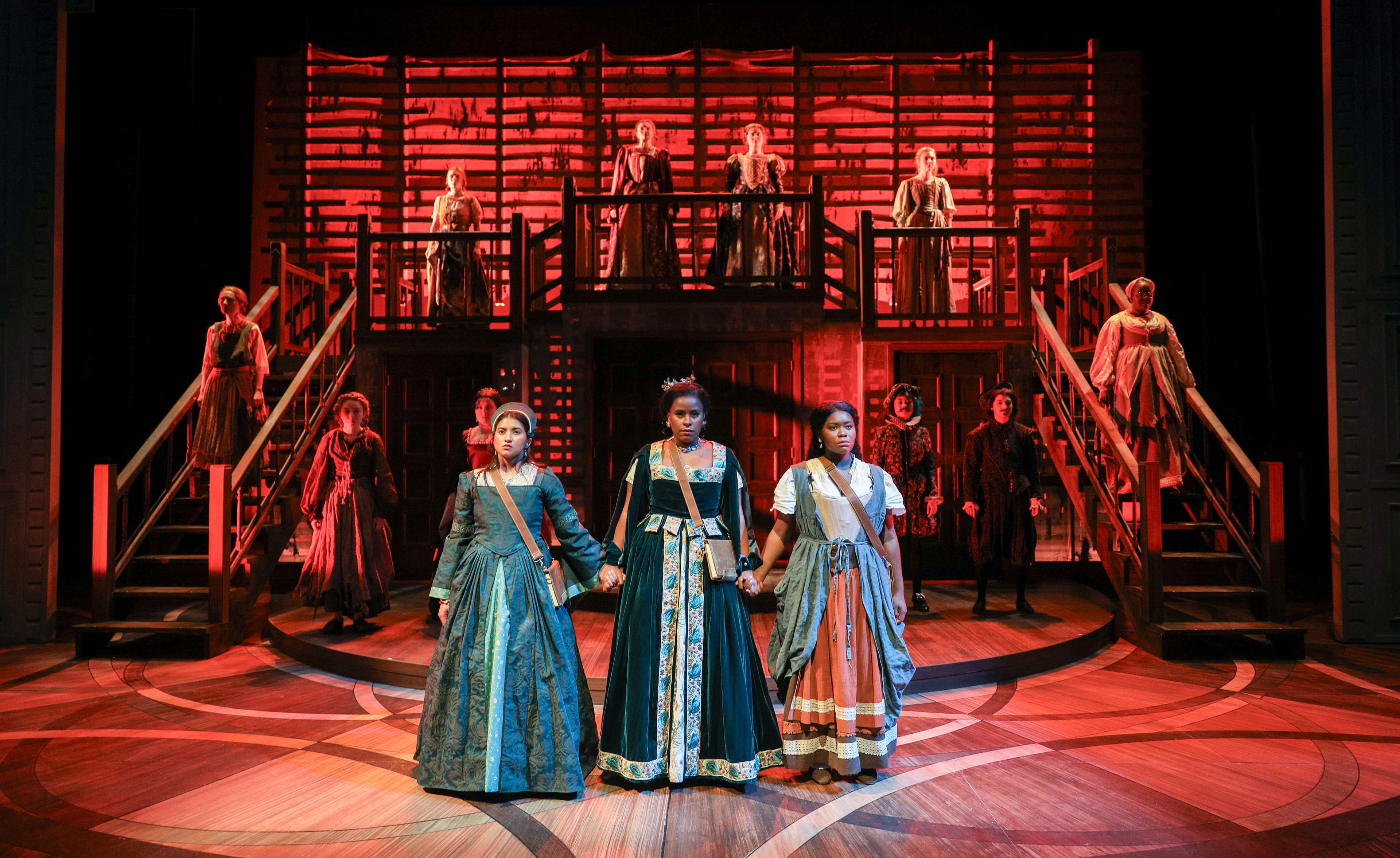 Portal that is vaguely house shaped, but not exactly inside or outside. All of the walls of the set are lathing covered in scrim, to create the "on fire" effect for the show. Floor is inspired by parquet wood floors, with the shape nodding to the Shakespeare Ruff collar.